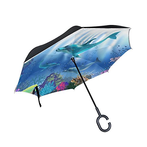 ISAOA grande ombrello invertito ombrello antivento doppio strato Reversed ombrello pieghevole per auto pioggia esterni, manico c-shaped self-standing delfino e mondo sottomarino ombrello