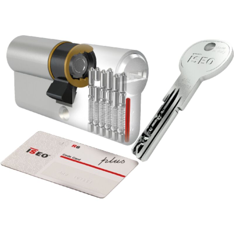 1,0 PZ Di ISEO R6 PLUS CILINDRO 5 CHIAVI 30X50 MM Mod. R6 PLUS sistema di chiusura di elevata resistenza alla torsione e alto numero di combinazioni. Sei pistoncini in acciaio inox. Con 5 chiavi in ottone sigillate + 1 chiave cantiere. Lunghezza 80 mm Misura 25.10.45 mm Finitura nichelata opaca.