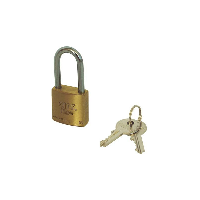 Corpo in ottone, arco lungo in acciaio temperato e cromato. Con 3 chiavi in acciaio. Larghezza 50 mm Luce arco 50 mm