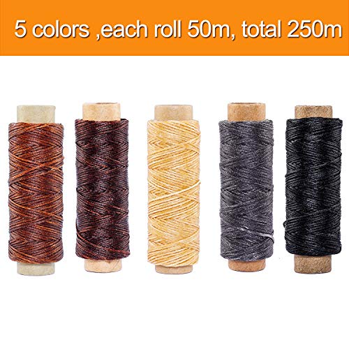 Filo cerato per uso pesante: filo di filo cerato in pelle a 5 colori realizzato in materiale di buona qualità ed è molto resistente e rivestito in cera, quindi rende i punti molto facili, morbidi al tatto, resistenti e durevoli, non facili da sfilacciare.