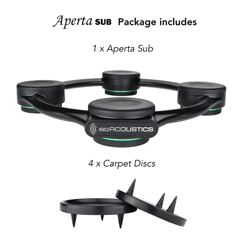 SCULPTED ALUMINUM ACOUSTIC ISOLATION STANDS: 10.5” (265mm) Wide x 11.5” (290mm) Depth x 1.3” (33mm) Height. 80 lbs (36.3 kg) weight capacity. Package includes 1x Aperta Sub & 4x Carpet Discs.