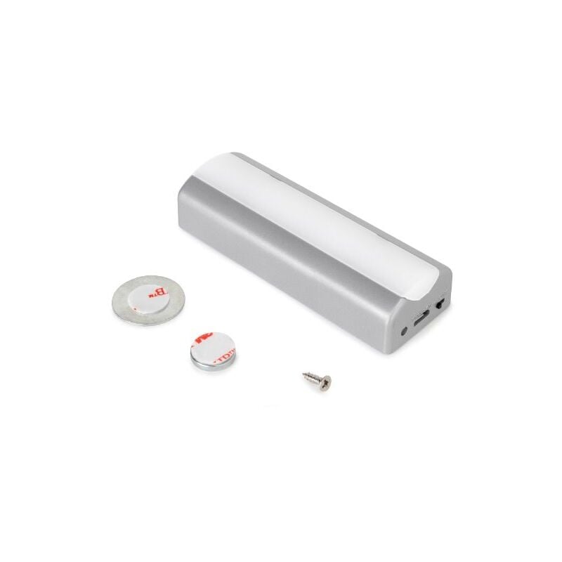 Luce LED Ricaricabile Con Sensore Di Vibrazione Caratteristiche del prodotto Progettato per illuminare l'interno dei cassetti. Tecnologia LED a basso consumo. Sistema di illuminazione senza fili: batteria ricaricabile al litio-polimero di 850mAh, che pu? essere ricaricata utilizzando un caricabatterie di cellulare di 5V DC 0,5A con chiavetta micro USB tipo B. Autonomia di 600 cicli di accensione per carica prima che la batteria si esaurisca (indicatore LED di stato di carica). Installazione sulla superficie del mobile con la base da avvitare o tramite un magnete adesivo, ci? che ne facilita la rimozione per la sua ricarica. Dispone di un sensore che si attiva per vibrazione all'aprire il cassetto. Temporizzatore di 12 secondi per lo spegnimento dell'illuminazione. Il montaggio si realizza in fondo al cassetto mediante viti o mendiante nastro biadesivo. Si includono viti e nastro adesivo per il montaggio. Fascio luminoso di 75 lumen. Potenza 1 W. Temperatura di colore bianco 4.000