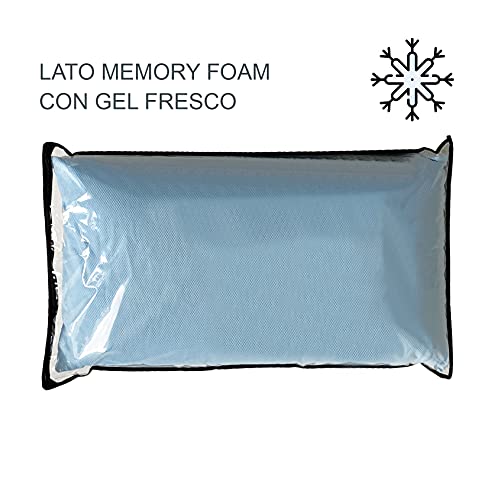 Guanciale “Summer/Winter” con due opzioni di utilizzo: lato azzurro (composto da fresco memory gel) ideale per l'estate e lato bianco (composto da tessuto memory) ideale per l'inverno. Guanciale disponibile nella seguente misura: 48x78cm. Peso: 2170 grammi