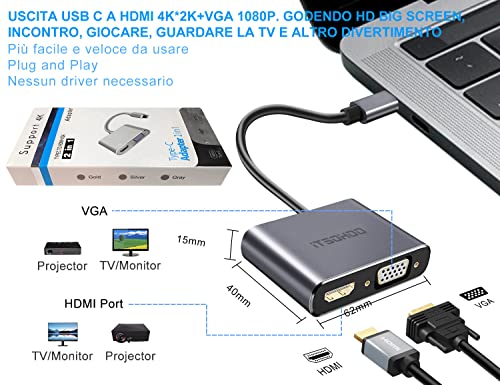 ITSOHOO Adattatore da USB C a HDMI VGA, Convertitore da USB tipo C Thunderbolt 3 a VGA HDMI 4K per MacBook Pro/Air 2020 2019, iMac, Dell XPS 13/15, Surface Go, Galaxy S20, Chromebook