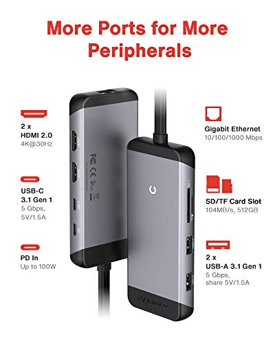 IVANKY Hub USB C 9 in 2, Adattatore USB C MacBook PRO con 2 Porte 4K HDMI, 2 Porte USB-A 3.0, Ethernet, USB C 100W PD, Porta Dati USB-C 3.0, Lettore di SD/TF per MacBook PRO 16, MacBook Air 2020