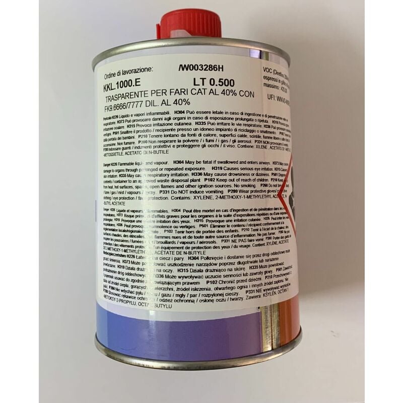 Iacuzzo Ferramenta CONTATTARE NEGOZIO EBAY TRASPARENTE BICOMPONENTE PER FARI IN POLICARBONATO PLASTICI 2:1 KKL.1000.E 500ML Trasparente 2k per il ripristino dei fari in policarbonato. Speciale trasparente bicomponente studiato per la verniciatura di materiali plastici a base di policarbonato, come fanaleria auto e componentistica in genere. La natura delle resine garantisce ottima adesione diretta sui supporti e protezione ai raggi UV. Il trasparente sostituisce il fi lm protettivo UV originale che con gli anni tende a sfarinare, mantenendo inalterata la resistenza meccanica del Policarbonato. Si consiglia di preparare il supporto eliminando completamente il vecchio film di protezione del faro con carta a secco P600 - P800 -P1500. Per eliminare eventuali graffi profondi si consiglia di iniziare la carteggiatura con carta P280. Sgrassare la superficie con antisilicone all'acqua e panno antistatico. Per controllare la corretta preparazione del supporto è consigliabile applicare una