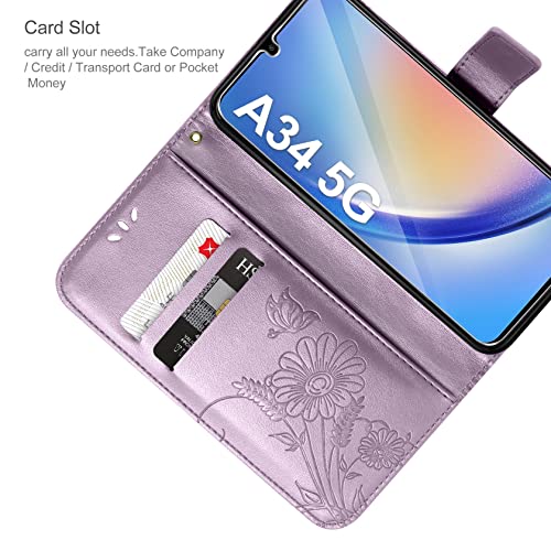Ivencase Cover Compatibile con Samsung Galaxy A34 5G Con 1 Pezzi Vetro Temperato, Book Cover Custodia Flip Caso in PU Pelle Portafoglio Magnetica Porta Carta Kickstand Cover - Viola chiaro