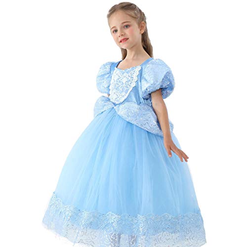 ❤❤ DESIGN BELLO: fantasia ragazze costume da principessa Cenerentola vestito lungo in tulle, manica corta, scollo quadrato, Stile pullover senza cerniera. Impreziosito da paillettes e decorazione ricami, top in velluto decoro pizzo e rete con ricamo, elastico in vita e scollo per vestirsi facilmente. Ragazza principessa costume cenerentola trasforma la tua ragazza in una bellissima principessa delle fiabe.