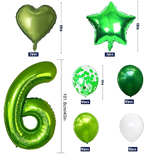 Set di palloncini a forma di dinosauro per il 6° compleanno: 1 x XXL verde, 6 x palloncini in pellicola da 101 cm, 4 x palloncini a forma di dinosauro + 48 palloncini in lattice (12 x verde scuro, 12 x verde, 12 x bianco, 12 x coriandoli verdi) + 2 x palloncini a forma di cuore in pellicola verde + 2 rotoli nastri.