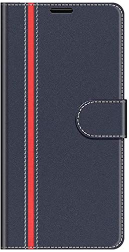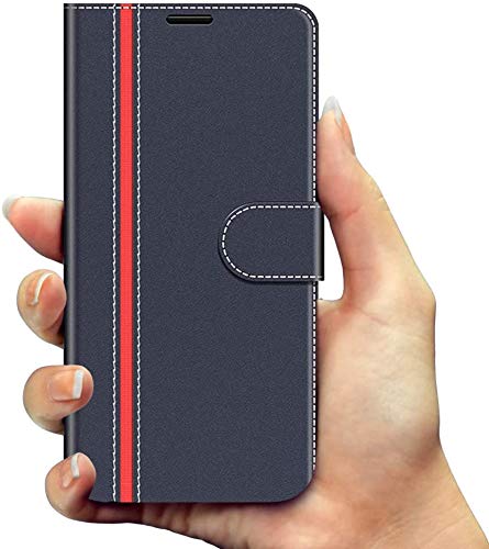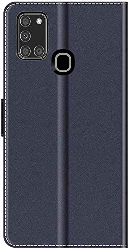 Iyhtc - Custodia per Samsung Galaxy A21s + pellicola protettiva in vetro temperato per Samsung Galaxy A21s, in pelle PU, con chiusura a linguetta, colore: Blu scuro/Rosso