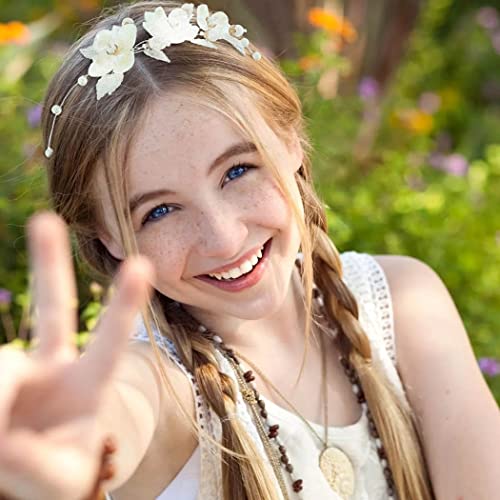 ☆ Copricapo da ragazza di fiori per ragazze di dimensioni approssimative: 11 * 1,97 pollici (28 * 5 cm), puoi facilmente fissare questo copricapo sulla testa dei tuoi bambini con questo nastro o fermagli per capelli. Colore bianco.