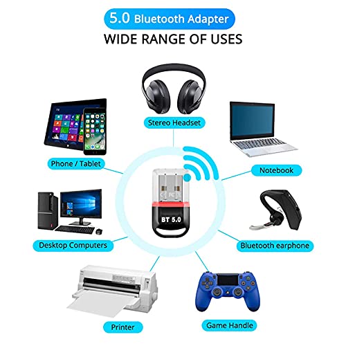 Múltiples Usos: Bluetooth CSR 5.0 USB Dongle adaptador puede fácilmente añadir función Bluetooth para su ordenador, permite al ordenador conectar de forma inalámbrica más dispositivos Bluetooth como auriculares Bluetooth, altavoces, receptor, teclado, ratón, smartphone, tableta, impresora, proyector, controlador de juegos, controlador xbox uno y más dispositivos BLE (Bluetooth de baja energía).