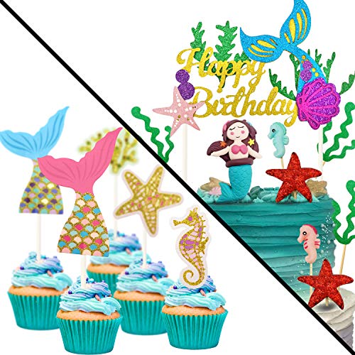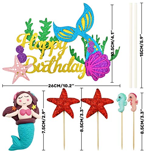 Toppers Di Buon Compleanno Per Mermaid Inclusi: 1 decorazione per torta di buon, 1 mermaid cake topper, 2 cavallucci marini ( rosa, blu), 2 stelle marine rosse lucide, 8 coda di sirena, 4 stelle marine, 4 cavalluccio marin, 4 alghe, 3 verde alghe. Si adatta meglio a torte da 6 pollici e 10 pollici.