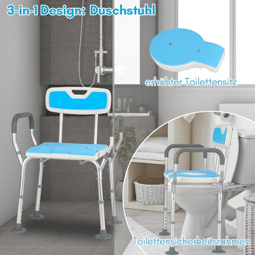 Izrielar Sgabello da doccia, sedia da doccia per senior, con schienale e bracciolo, regolabile in altezza, sgabello da bagno con cuscino rimovibile, antiscivolo, in alluminio