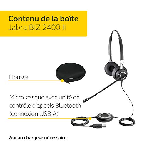Contenuto della spedizione: Jabra Biz 2400 II USB-A BT Unified Communication On-Ear Mono Headset, unità di controllo, Bluetooth, gancio auricolare, archetto, custodia - Peso: 43g - Colore: nero