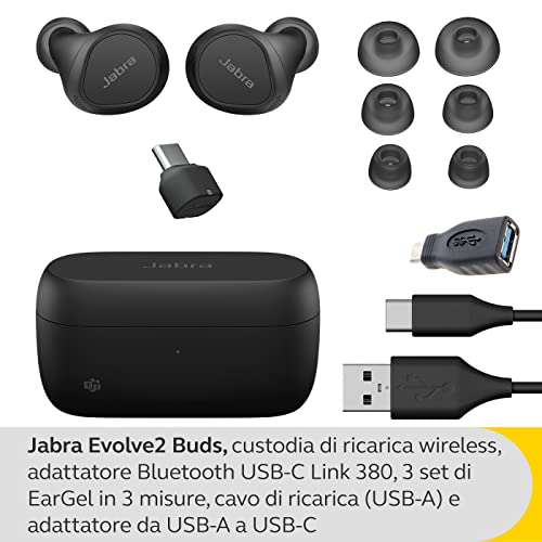 Nella confezione: 1 x Jabra Evolve2 Buds, custodia di ricarica certificata Qi, adattatore Bluetooth USB-C Link 380, EarGel 3 misure, cavo di ricarica, adattatore USB-A-USB-C. Peso 5,4 g, nero.