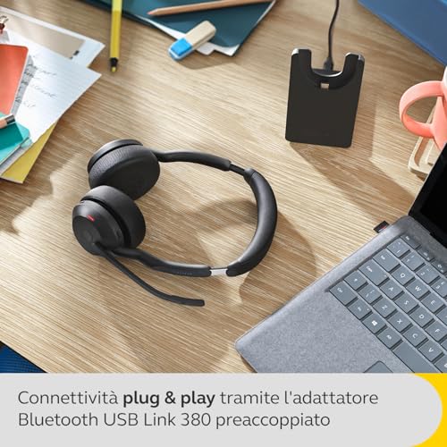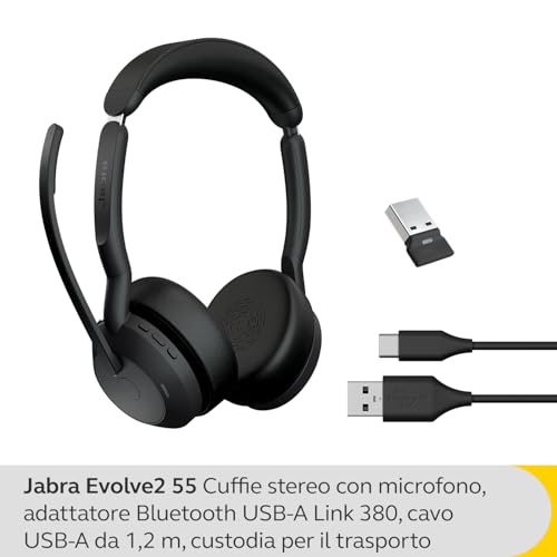 Nella confezione: 1x Jabra Evolve2 55 Cuffie Wireless Stereo Bluetooth con adattatore Bluetooth Link 380 USB-A, cavo USB-A, custodia per il trasporto, peso delle cuffie: 130 g, colore: nero