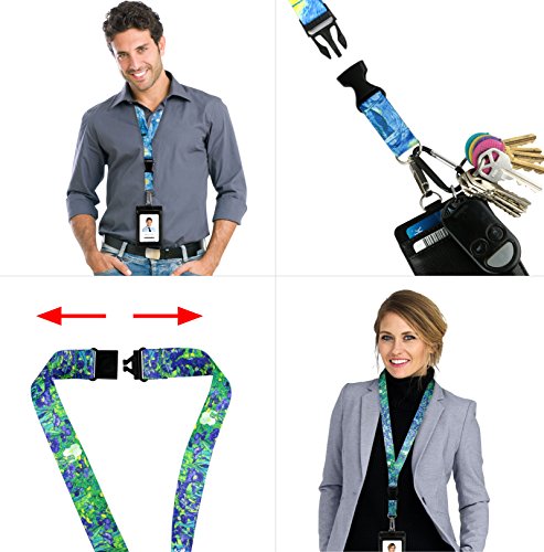 Dimensioni: cordino, 3/10,2 cm Larghezza, lunghezza dal collo alla parte superiore di badge clip, 41,9 cm Lunghezza dal collo alla parte superiore di fibbia a rilascio a scatto. Finta pelle ID Badge: 7 x 10,8 cm. Moschettone portachiavi torcia con portachiavi staccabile: 0.8 x 4,4 cm.