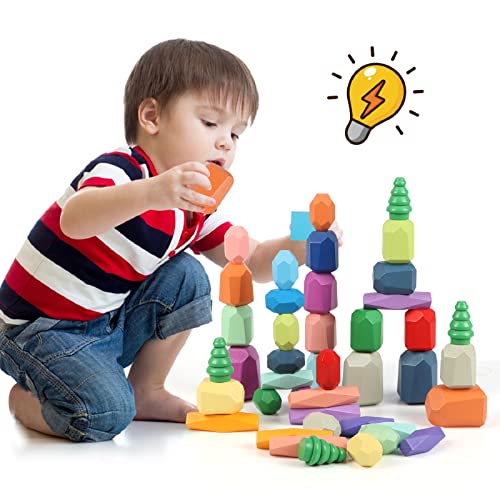 Jacootoys 42PCS Sassi di Legno impilabili Giocattoli Montessori Pietre di bilanciamento educative Grandi Dimensioni Blocchi da Costruzione Regalo di Compleanno per Bambini Ragazzi Ragazze 3 ai 5 Anni