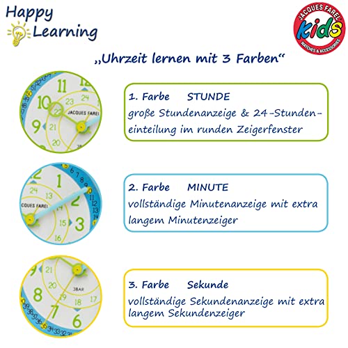 Orologio educativo: apprendimento facilitato delle ore grazie ai 3 colori: verde per le ore, blu per i minuti e giallo per i secondi.
