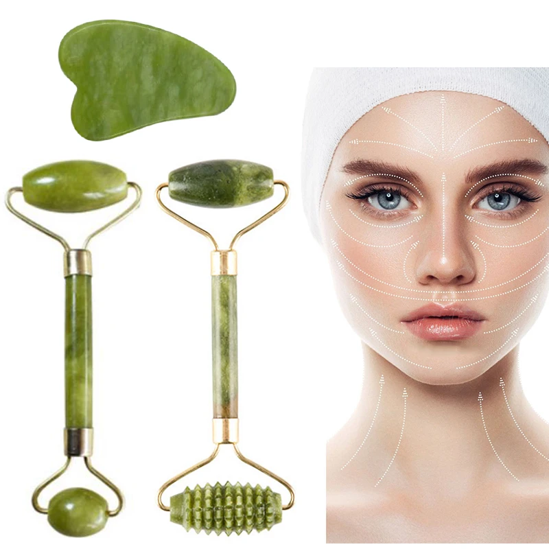 Jade Stone Facial Massage Roller For Face Neck Natural Massager Green Guasha Scraper Set Thin Lift Beauty Slimming Tools Roller