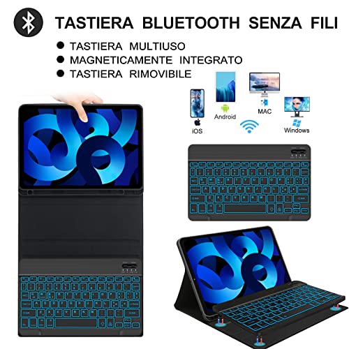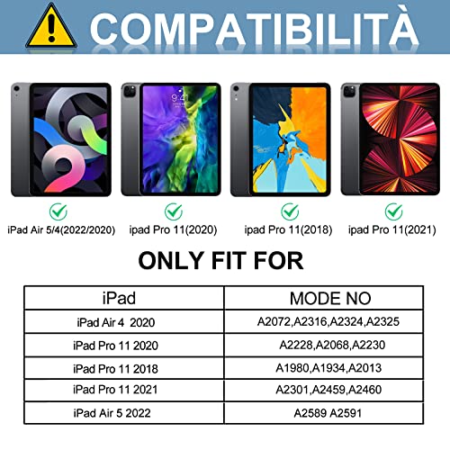 Compatibilità: La custodia con tastiera per iPad Air 5 generazione 2022(A2588/A2589/A2591), iPad Air 4 2020 (A2072/A2316/A2324/A2325) e iPad Pro 11 3/2/1 generazione 2021/2020/2018(A1980/A1934/A2013/A1979/A2228/A2230/A2231). Si prega di controllare il modello del proprio iPad prima dell'acquisto.