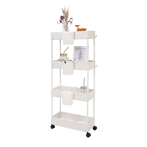 JAKAGO Carrello Portaoggetti a 4 Livelli,Carrello Portaoggetti su Ruote Scaffale da Cucina con Tazza Appesa Carrellino Salvaspazio per Cucina Bagno Ufficio Biblioteca Salone-Bianco
