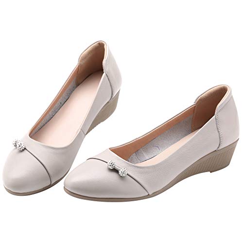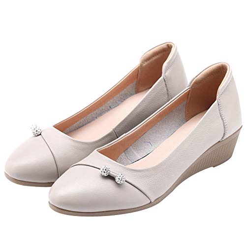 Jamron Donna Suola Morbida Tacco Basso a Zeppa Vera Pelle Ballerine Dolly Scarpe Beige SN02631 EU35