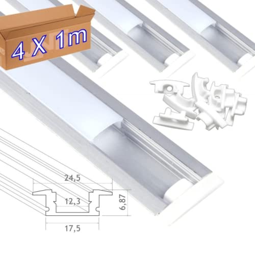 JANDEI - 4x Profilo in alluminio 1m x 24,5x17,5mm per incasso strip LED, diffusore per luce LED con calotta tonda traslucida, kit completo per installazione (comprende testate terminali)