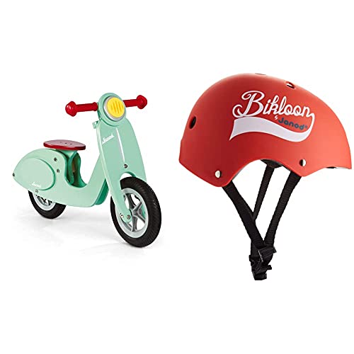 Janod Bici Senza Pedali In Legno Scooter, Look Vintage, Sellino Regolabile & Bikloon Casco Per Bici Rosso, E Bici Senza Pedali, Per Bambini, Taglia S, Girotesta Regolabile