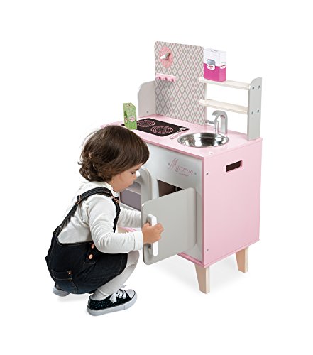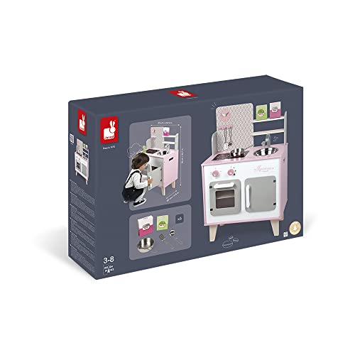 Janod - Cucina Giocattolo Macaron - Mini Cucina per Bambini - in Legno, con Forno, Lavello Inox, Armadietto, Pulsanti e Orologio, Cucina, in Legno, con 5 Accessori - Da 3 a 8 Anni - J06567