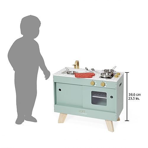 Janod - Cucina in Legno Loft - Giocattolo Imitazione Cucina Ristorante - Stile Vintage e Moderno - 7 Utensili in Metallo e Guanto - Vernice ad acqua - Dai 3 Anni, J06556