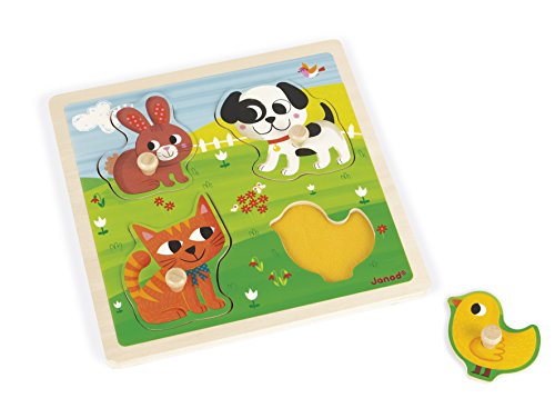 Janod - Wooden Tactile Puzzle, My First Animals, 4 Pieces - Children's Pin Jigsaw Puzzle - Educational and Sensory Game - Touch, Fine Motor Skills and Concentration - From 12 Months, J07080