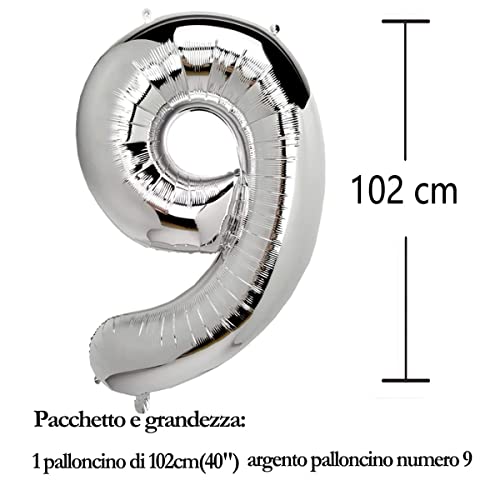 JARTTY Palloncino Numero 9 Argento 102 CM Giganti Palloncini Compleanno 9 Anni Palloncini Numeri 9 Argenti Decorazioni Festa Gonfiabili Compleanno Elio Palloncino