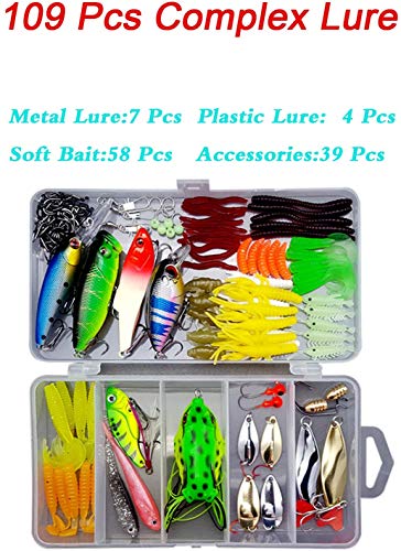 ❥[Vari accessori da pesca] - Il set di attrezzatura da pesca viene fornito con 109 pezzi e 7 tipi di accessori da pesca multifunzionali, inclusa una scatola di attrezzatura. Il set include Vermi, Esche Dure, Ganci Singolo, Insetti.