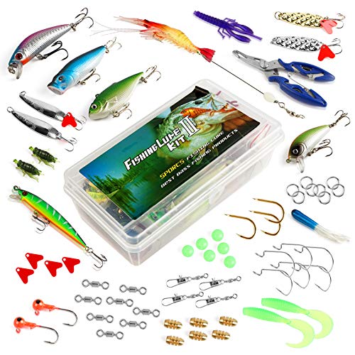 [300 Pezzi accessori] -Il set per attrezzatura da pesca viene fornito con 110 pezzi esche e 10 tipi di accessori per la pesca multifunzionali, inclusa girelle, perline di pesca, connettore girevole, pinze, Jig heads, esche morbide, ganci per stampi, vermi, rana topwater.