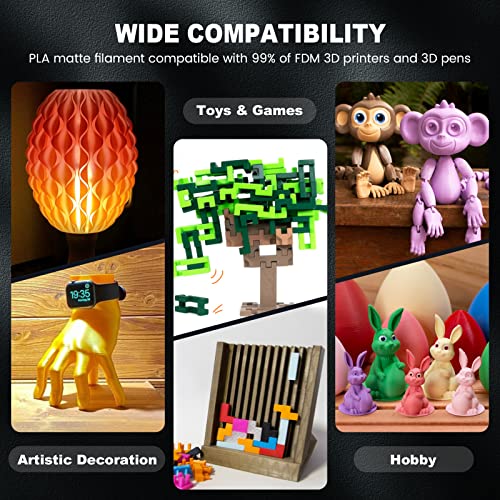 【Clog-Free & Bubble-Free】Il filamento Matte PLA da 1,75 mm ha una migliore scorrevolezza, che riduce efficacemente l'intasamento durante la stampa. L'imballaggio sottovuoto in plastica e l'essiccante rendono il filamento meno suscettibile all'umidità.