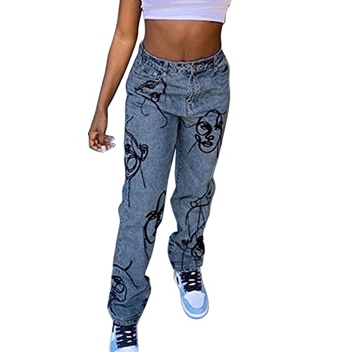 Jeans da donna, casual, a vita alta, in denim, con tasche, vestibilità comoda, dritta, stile vintage, C-blu, XS