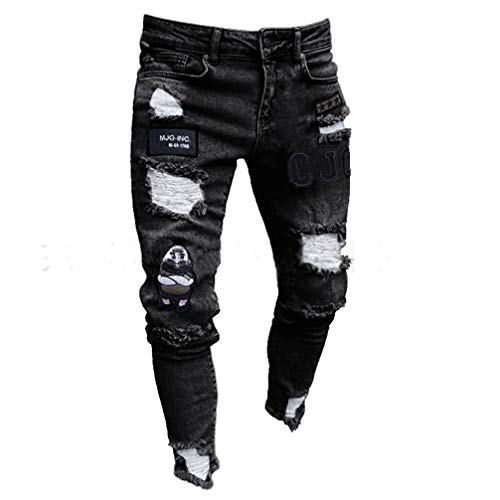 Jeans Moda Uomo Pantaloni Lunghi Pantaloni da Lavoro da Ciclismo in Denim sfilacciato strappato Slim Fit (Black, L)