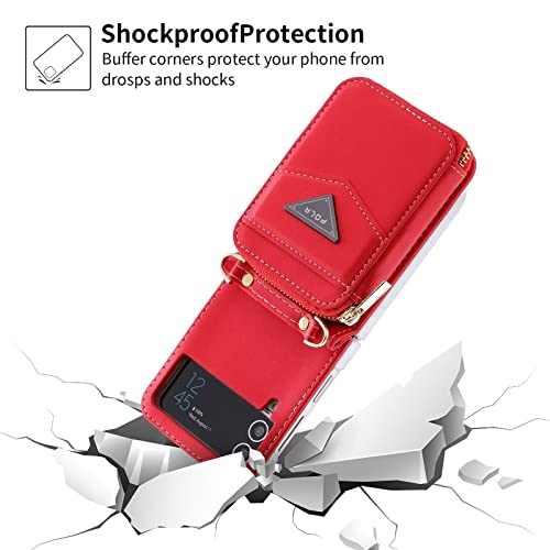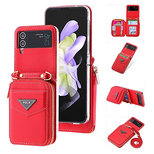 Jeelar ESONG Cover a Portafoglio per Samsung Galaxy Z Flip 4 con Cinturino,Custodia Antiurto Protezione con Slot per Schede/Cordino/Stand,Caso in Pelle Premium PU Protettiva Case per Donna-Rosso