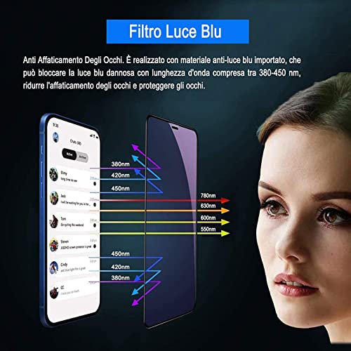 【Filtro luce blu】- Anti Affaticamento Degli Occhi. È realizzato con materiale anti-luce blu importato, che può bloccare la luce blu dannosa con lunghezza d'onda compresa tra 380-450 nm, ridurre l'affaticamento degli occhi e proteggere gli occhi. Quando il telefono è acceso,Che non cambierà la qualità dell'immagine originale del telefono mentre blocca la dannosa luce blu e quando il telefono è spento, la protezione per lo schermo sarà viola chiaro e Sarà opaco finish;