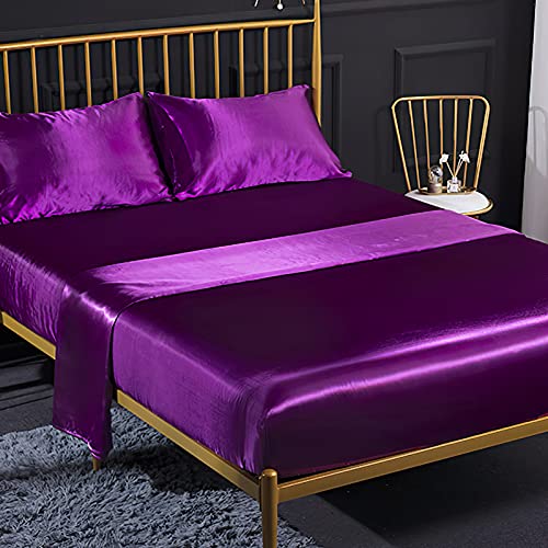 Jemiipee 4 Pezzi Completo Lenzuolo Letto Matrimoniale, 1 x Lenzuola Sotto con Angoli Tinta Unita 180x200 cm con 1 x Lenzuolo Piatto e 2 x Federe, Biancheria da Letto in Raso, Magenta Scuro