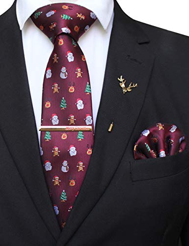 JEMYGINS Cravatta Uomo Borgogna. Albero di Natale. Pupazzo di neve in Seta Ricamata di Natale Christmas con Fazzoletto e Fermacravatta