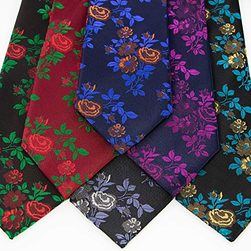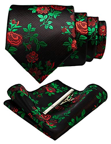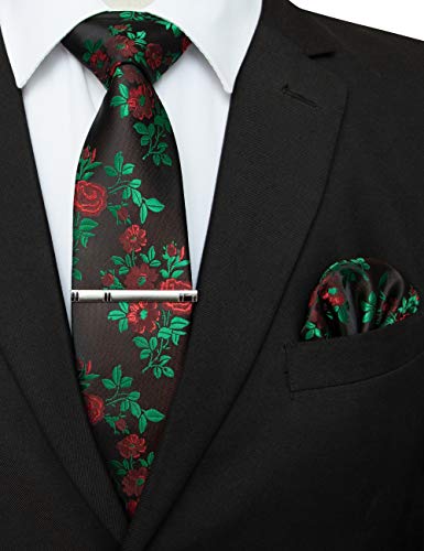 JEMYGINS Cravatta Uomo Verde/rosso in Seta Ricamo Rosa con Fazzoletto e Fermacravatta Insieme Scatola Inclusa(6)