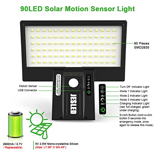 JESLED Luce Solare con 90 LED, Lampada Solare da Esterno con Sensore di Movimento, 4 Modalità di Illuminazione Opzionale, Lampade Solare Impermeabile, Lampada Esterna per Giardino, 1 Pezzi
