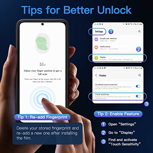 [Vetro Temperato Premium] Sia la protezione dello schermo che la protezione dell'obiettivo della fotocamera sono realizzate con materiale antigraffio con durezza 9H. Altamente reattivo e HD chiaro (NOTA: per un migliore sblocco delle impronte digitali, vai alle Impostazioni del dispositivo per attivare la sensibilità al tocco e aggiungi nuovamente l'impronta digitale dopo aver installato la pellicola)