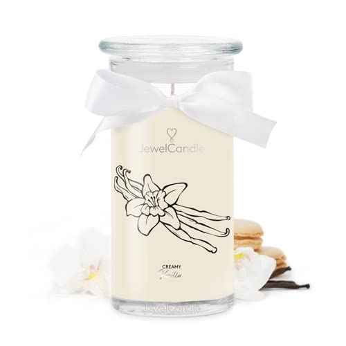 Il regalo perfetto: 'Creamy Vanilla' è una candela profumata di colore beige con un gioiello al suo interno. Il regalo perfetto per i tuoi cari.