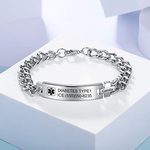 Jewelora Braccialetti identificativi personalizzati per allerta medica per adulti incisi per uomo, donna, bracciale, catena d'argento, braccialetti sportivi, braccialetti medici di emergenza