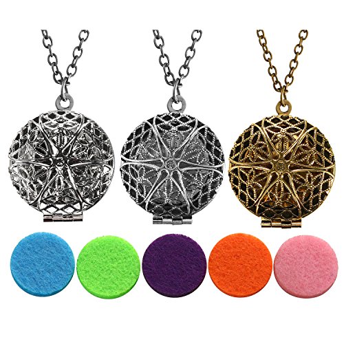 JewelryWe 3pcs Aromaterapia Collana con Pendente Diffusore dell'Olio Essenziale, Lotus Felicita Originale Regalo Retro Collana Pendente dell'Annata per il Amore, 5 Feltri