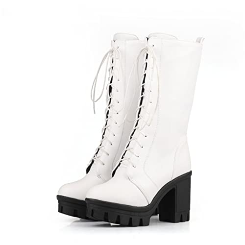 JFISQ Stivali Da Donna Stringati Gotici Stivaletti Con Plateau Da Studente Con Tacco Largo Stivaletti Cosplay Stivaletti Lolita Stivali Invernali Antiscivolo Da Motociclista Caldi,Bianca,39